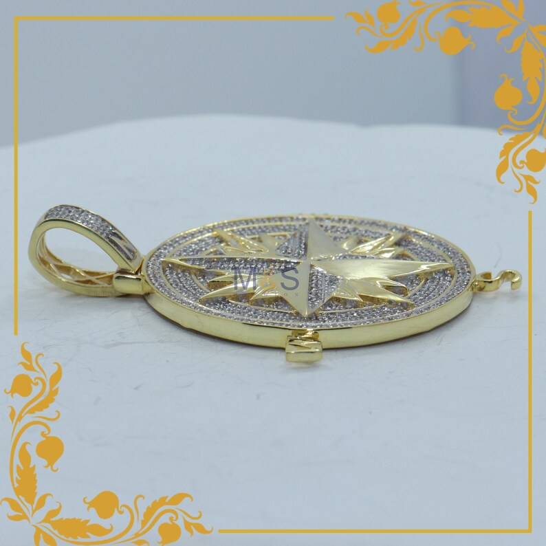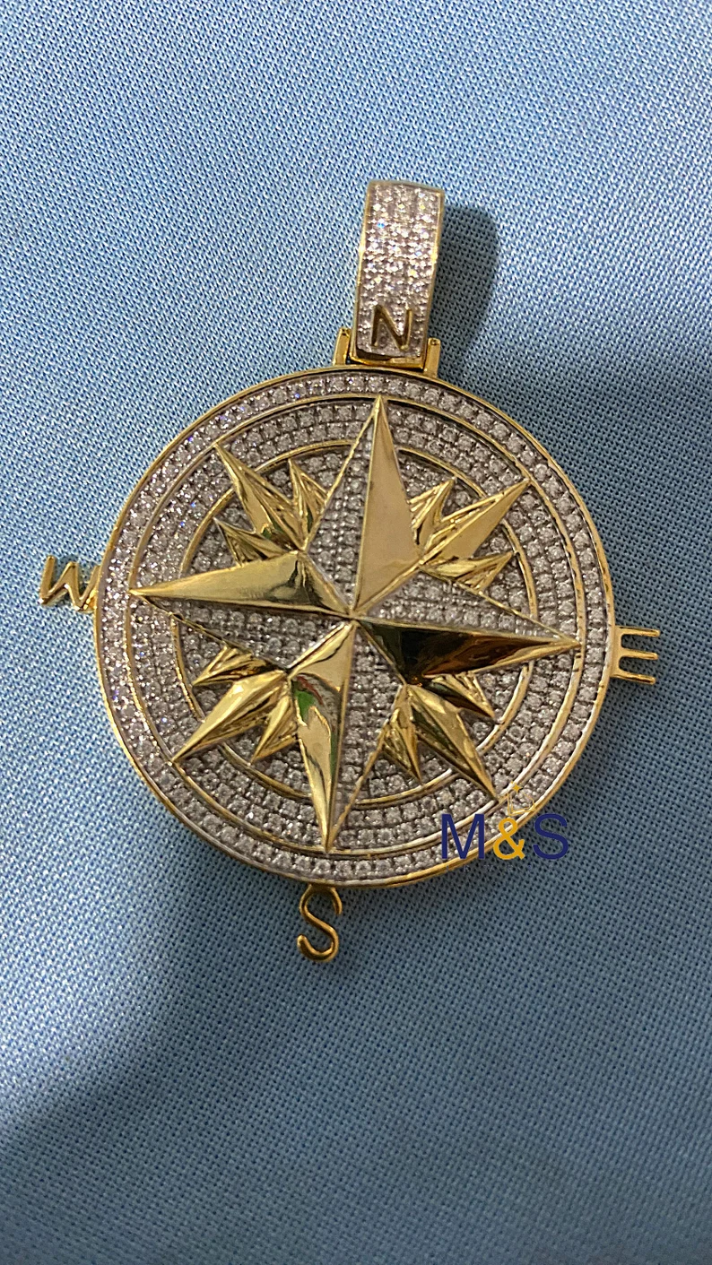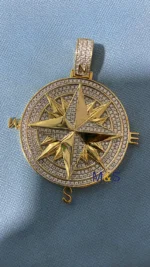 Iced out Moissanite Mens Compass 10K Yellow Gold Finish Simulated Diamond Traveler Compass 925 Sterling Silver Nautical Direction Pendant.